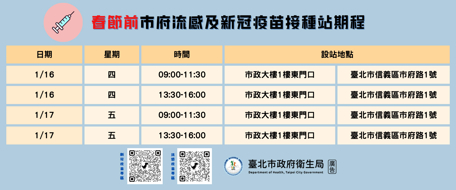 二、流感疫苗與新冠JN.1疫苗皆開放全民接種,為強化市府員工及洽公民眾免疫力,降低流感與新冠肺炎傳染與群聚的風險,本局於本府市政大樓設置免費疫苗接種站,提供接種服務,請貴機關(學校)運用多元管道,鼓勵所屬人員及洽公民眾踴躍參與。