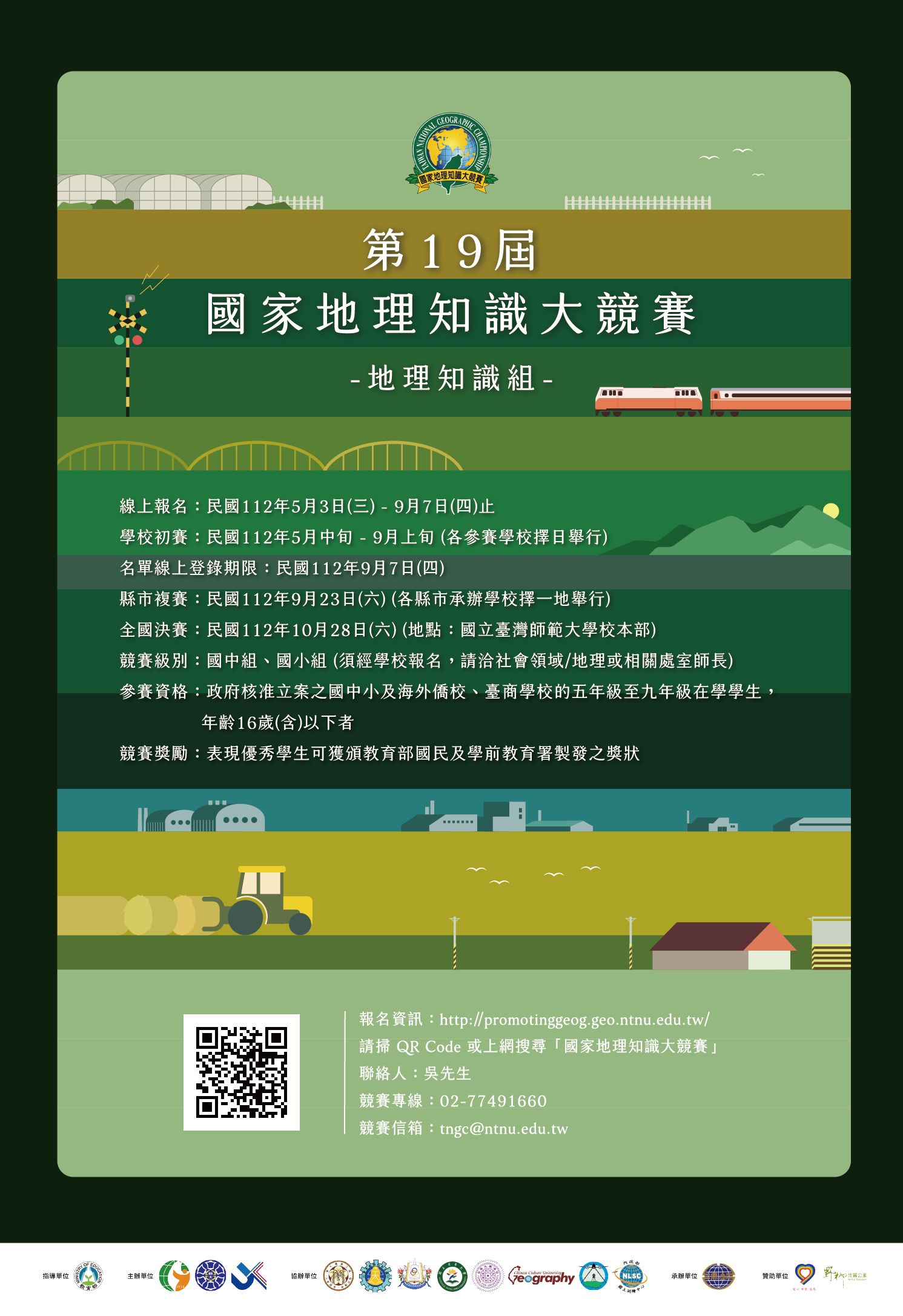 第19屆國家地理知識大競賽,競賽項目分為「地理知識組」與「環境觀察暨手繪地圖組」(簡稱手繪地圖組)等2項,自112年5月3日(星期三)開始報名至112年9 月7日(星期四),相關活動訊息與報名資訊詳參附件及該 競賽網頁。