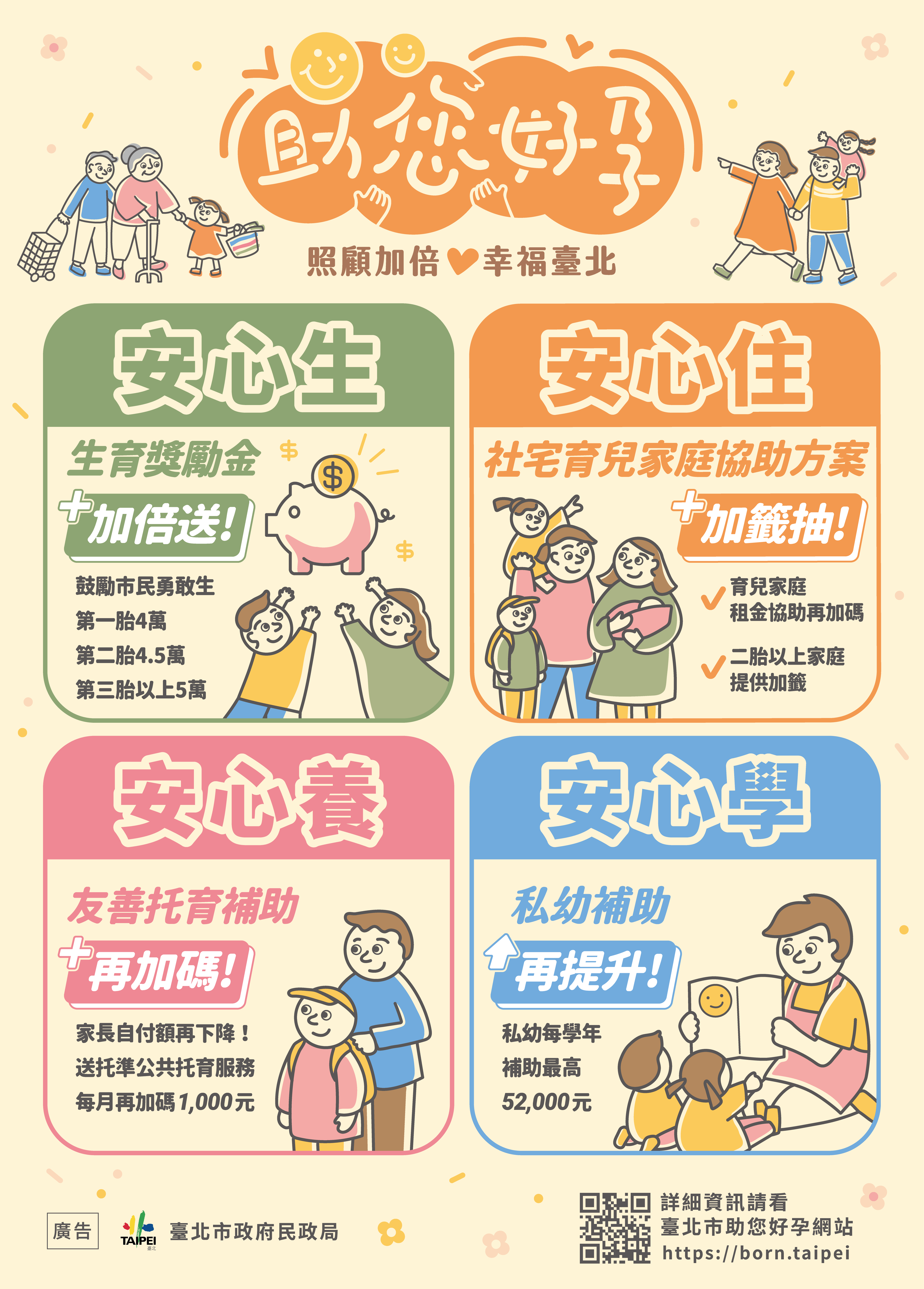 說明: 一、臺北市助您好孕專案推出生育獎勵金加倍送、社宅育兒家庭協助方案、友善托育補助再加碼、私幼補助再提升等措施,更多友善育兒政策可至助您好孕網站查詢。