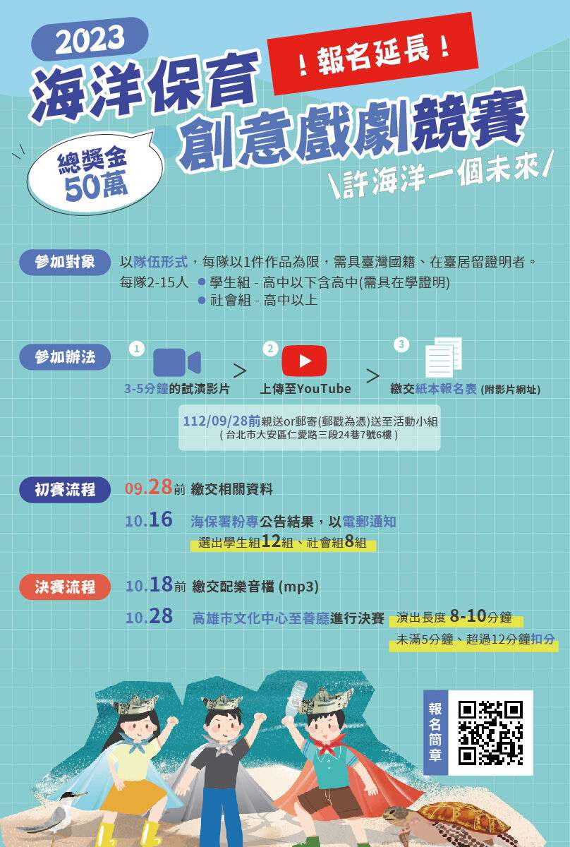 一、為擴大推廣海洋保育教育,該署112年度舉辦旨揭競賽活 動,並邀請教育部、文化部及農業部擔任指導單位,期望 透過不同領域國人共襄盛舉,發揮創意思維,以多元形式 演繹如何「許海洋一個未來」,歡迎組隊報名參加競賽。