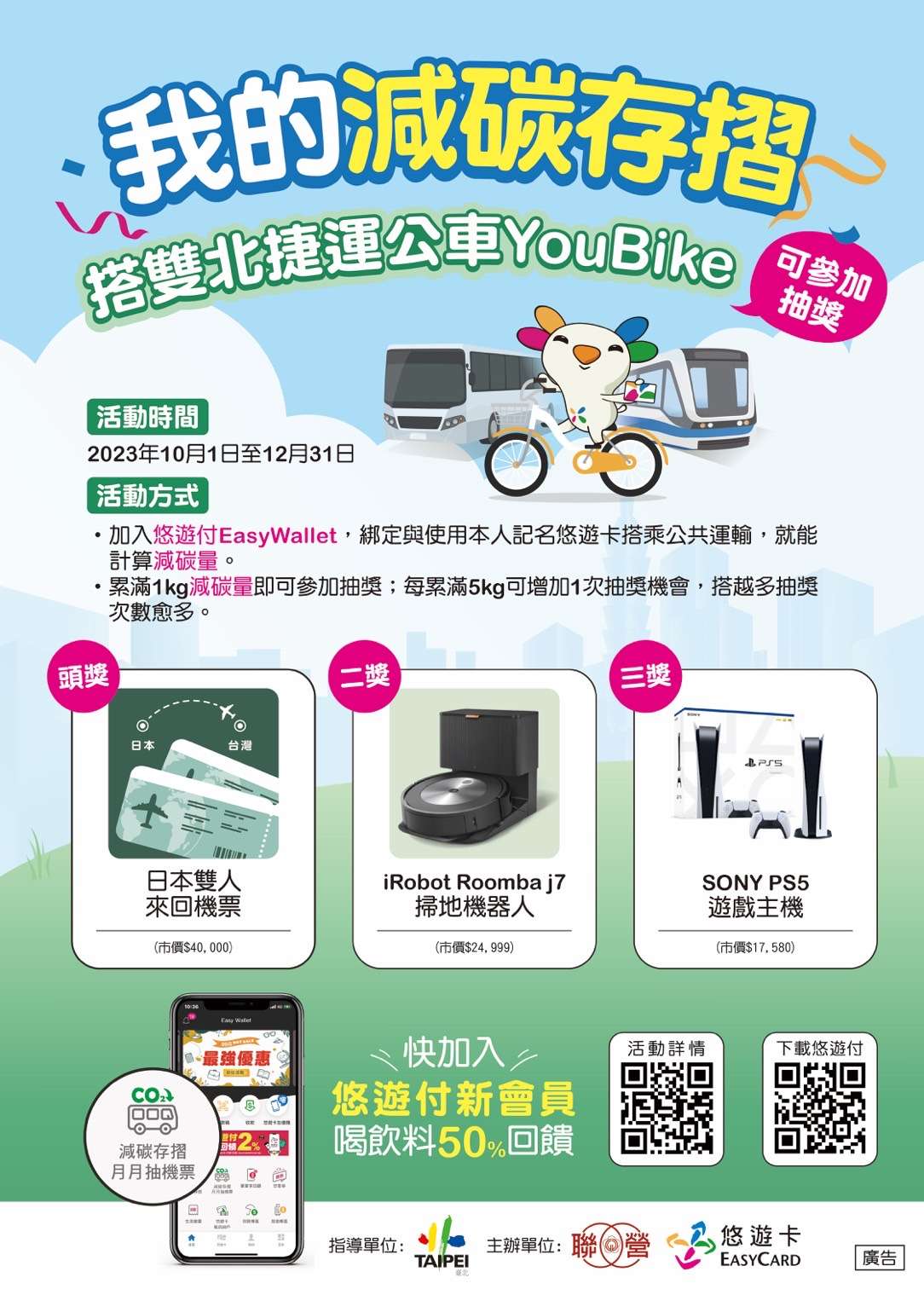 二、上開活動於112年10月1日至112年12月31日止,只要加入 「悠遊付Easy Wallet」APP會員,綁定與使用本人記名悠 遊卡,搭乘雙北公共交通運具(公車、捷運、輕軌及 YouBike)就能計算減碳量。累計滿1kg減碳量即可獲得當 月抽獎資格1次,每累計滿5kg,可再增加1次抽獎機會,累 計滿10kg則多2次,以此類推,搭乘公共運輸越多,就有越 多中獎機會。