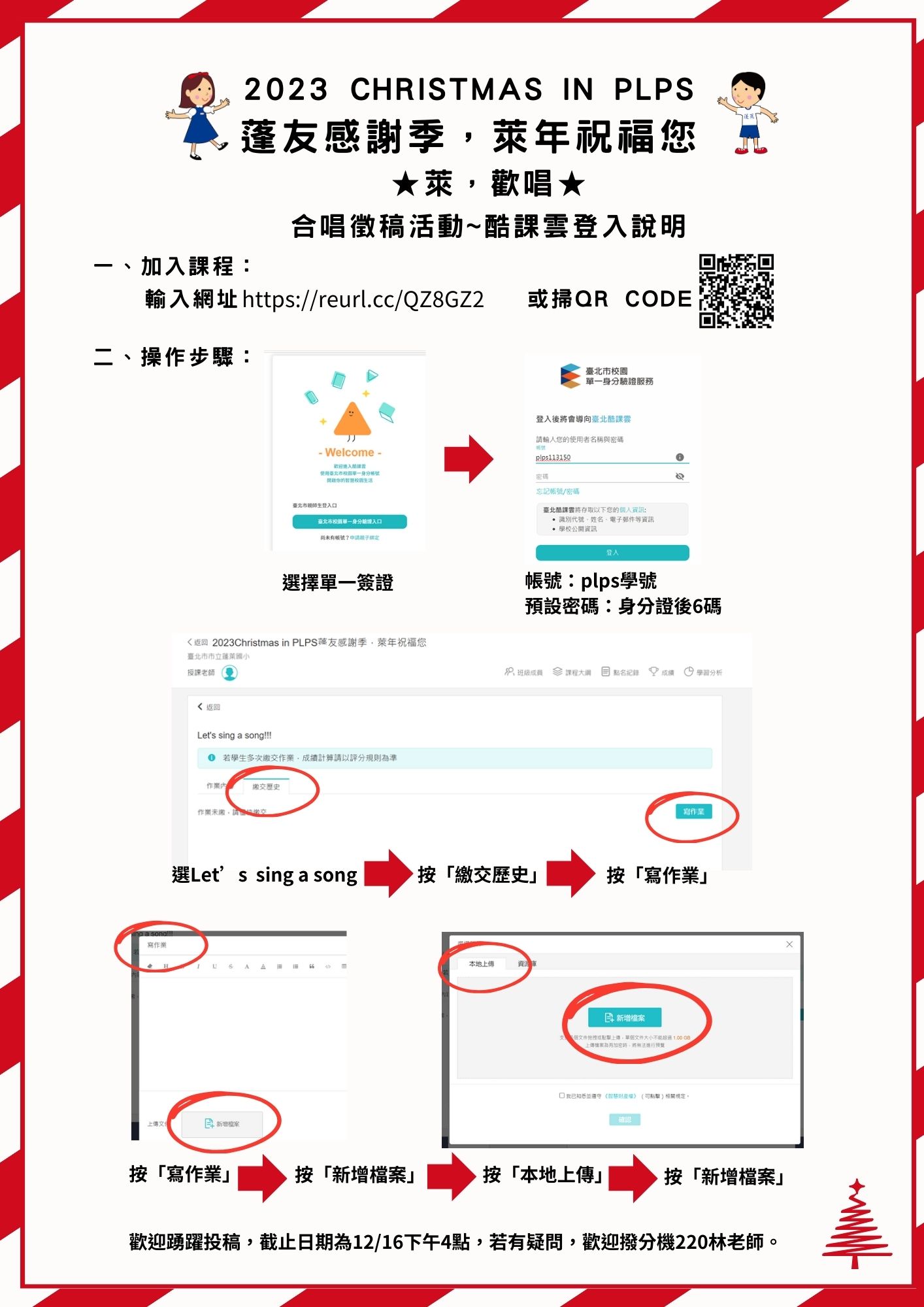 2.歡迎孩子上傳自己演唱的聖誕歌曲「We wish a merry Christmas」影片,只要上傳影片,就可以獲得30點E酷幣!影片被錄取的同學,除了再加贈30點E酷幣外,還有特別的禮物!演唱的影片會被剪輯成段落,公開在學校網站上撥放喔!歡迎同學們踴躍投稿!
