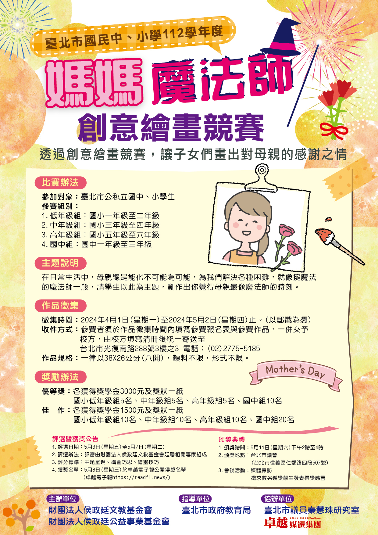 財團法人侯政廷文教基金會及財團法人侯政廷公益事業基 金會辦理「媽媽魔法師」創意繪畫競賽,透過創意繪畫競 賽,畫出對母親的感謝之情。