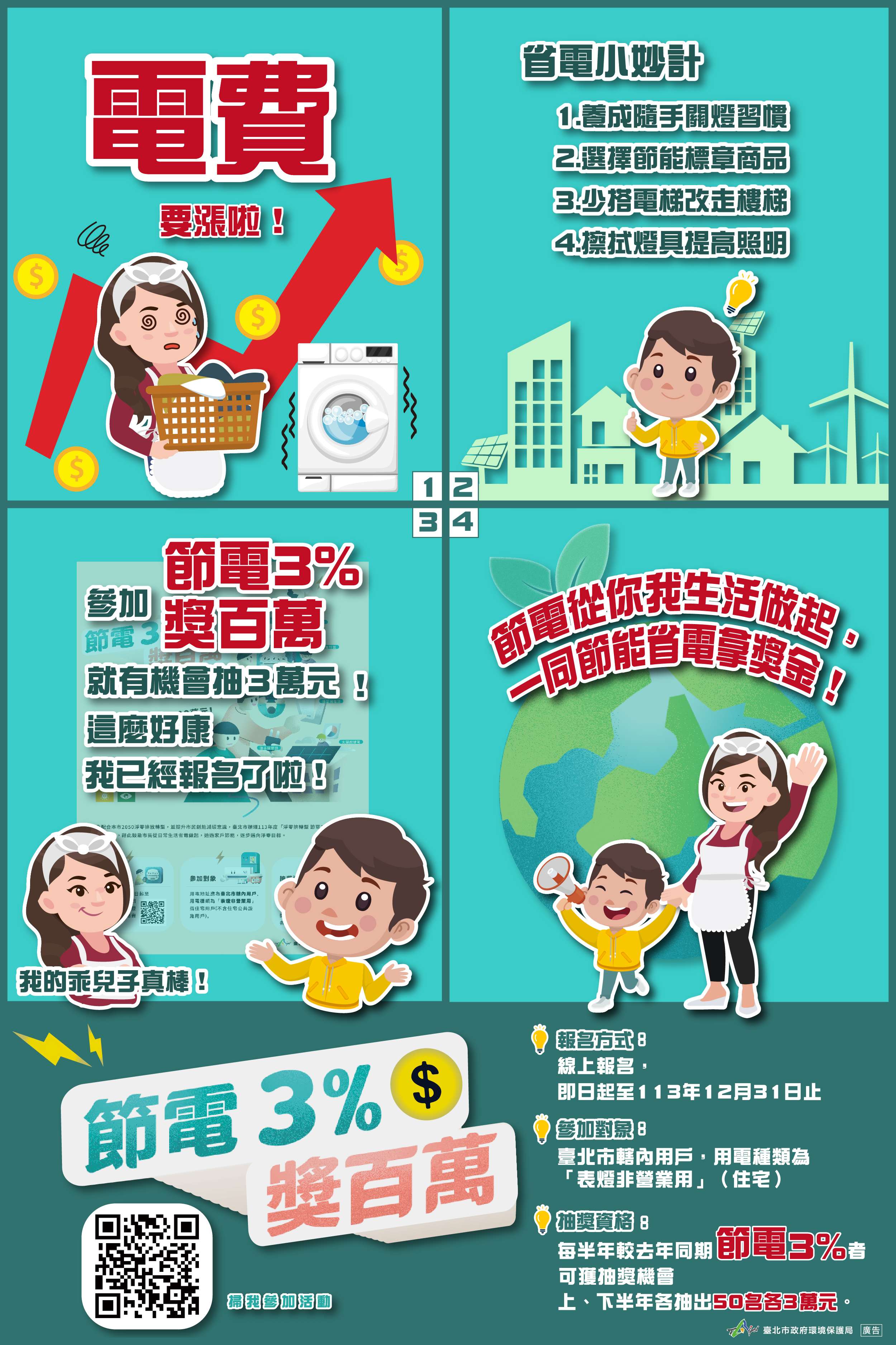 一、為鼓勵市民落實節能減碳行動,本府環境保護局於113年3月1日推出旨揭活動,因應本市2050淨零排放及經濟部宣布4月起調漲電價,民眾於日常生活中精進用電習慣等行動更顯重要。