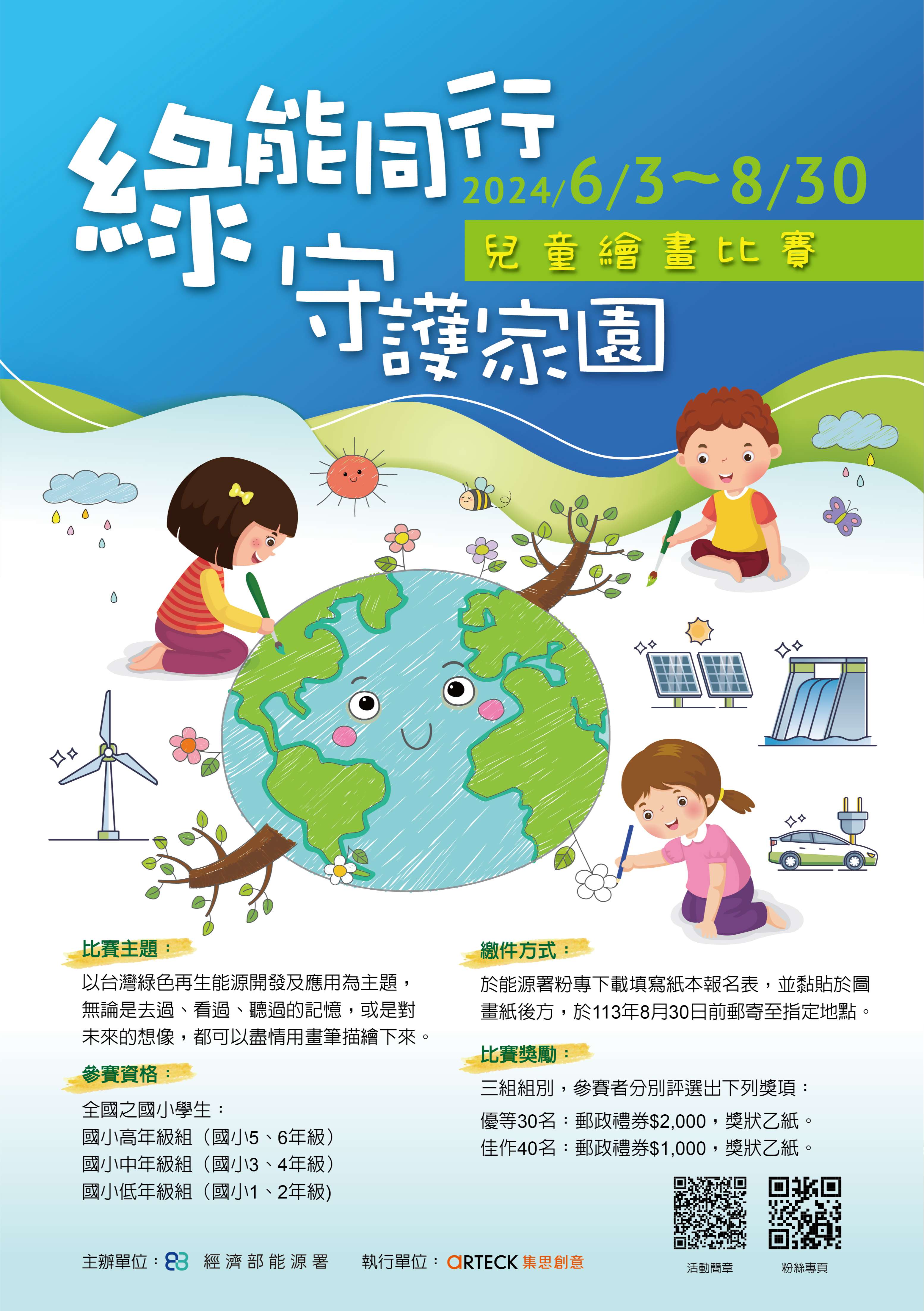一、綠能發展不僅提升我國能源自主性及改善環境品質,為下 一代奠定能源永續發展之基礎,該署舉辦2024「綠能同行 守護家園」兒童繪畫比賽,鼓勵兒童以各式發展中之綠能 為靈感,運用色彩及線條等彩繪方式,展現無限想像力及 創造力。