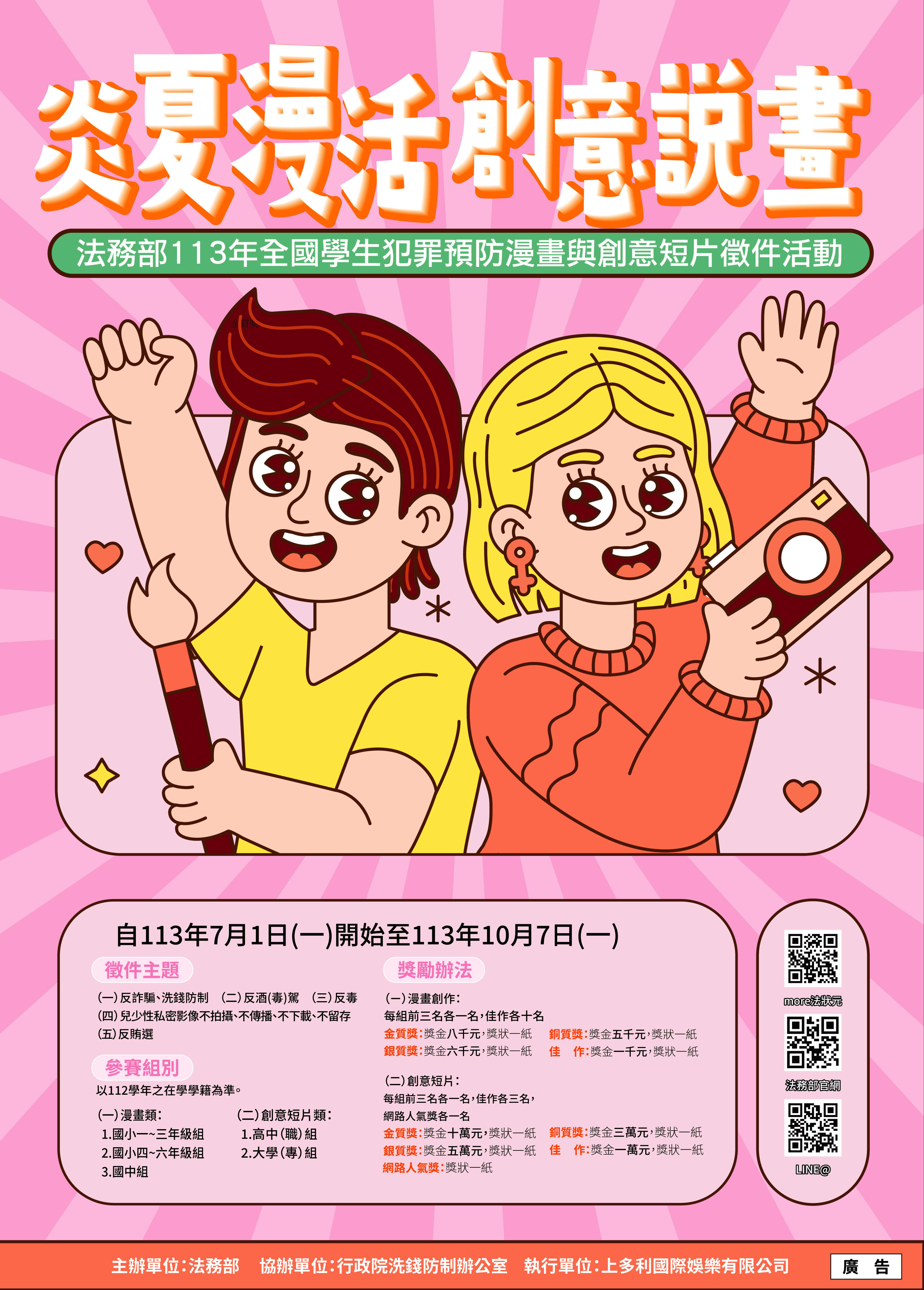 徵稿期間自113年7月1日至10月7日,採線上報名,有關徵稿活動相關訊息及報名資料下載,請於7月1日至下列網站搜尋:活動官網(https://www.mojgov2024.com.tw/)、 法務部「More法狀元」網站(https://tpmr.moj.gov.tw)「年度活動」或facebook搜尋:More法狀元-兒童及青少年犯罪預防宣導網。
