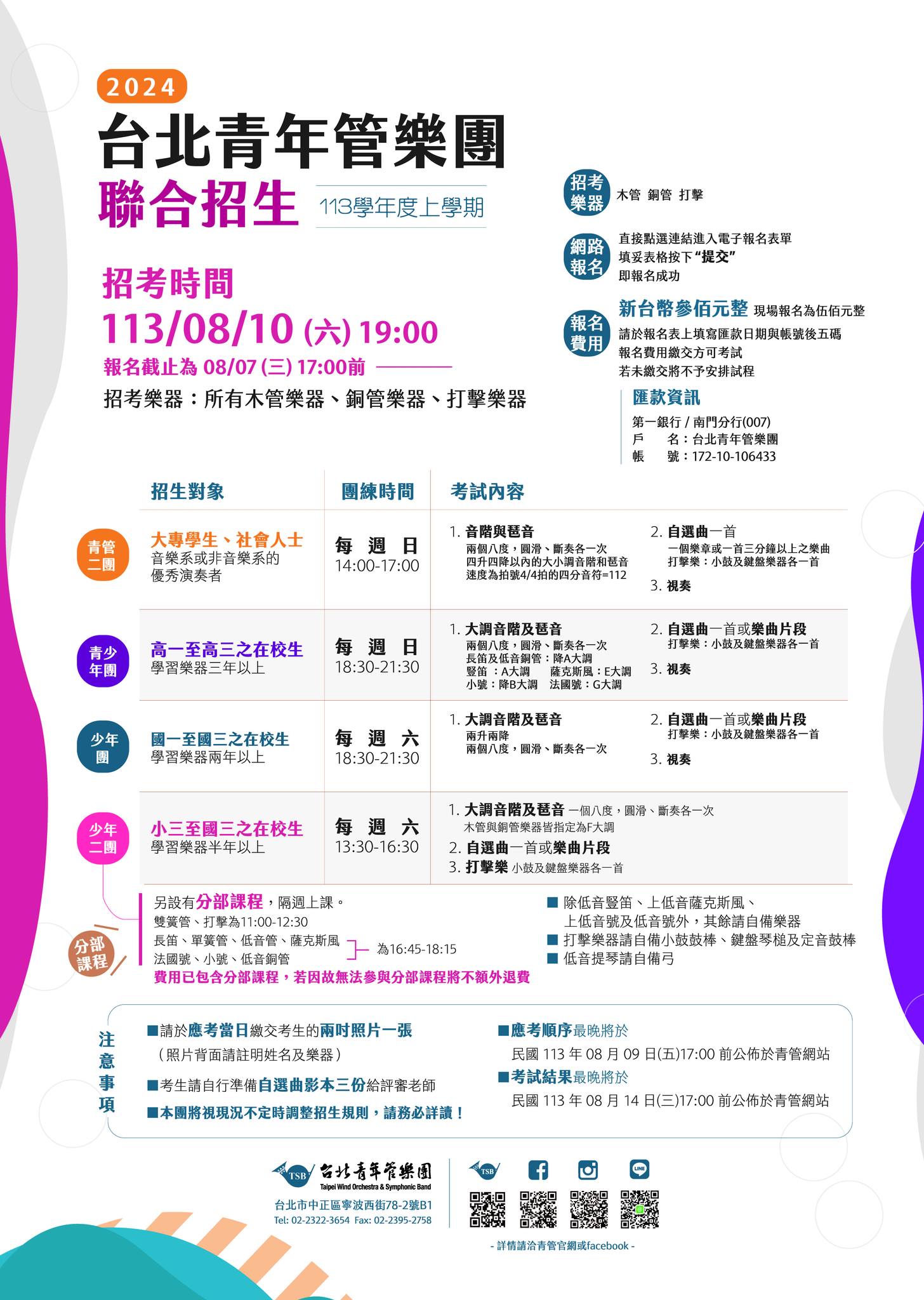 (四)相關招生資訊請至台北青年管樂團臉書粉絲專頁查詢 (http://www.facebook.com/tsbgroup/)。