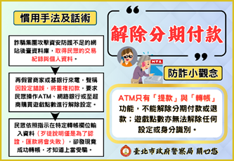 任何指稱「至自動提(存)款機操作,以解除分期付款」說詞,必屬詐騙,勿聽信操作。