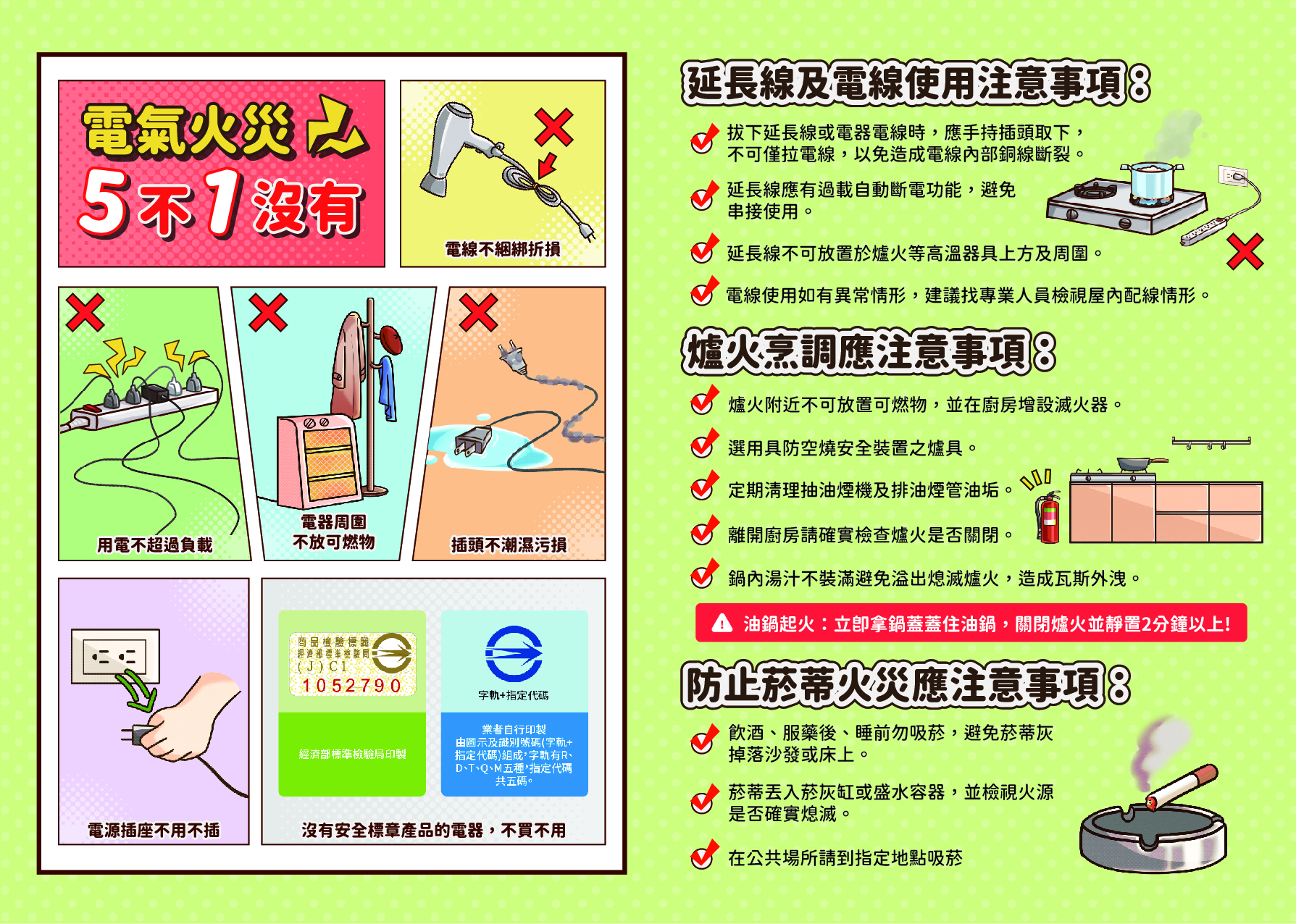 5、住宅防火 10 招:1.菸蒂確實熄滅 2.定期清理廚房油垢 3.勿堆 積雜物防止縱火 4.嚴禁孩童玩火釀災 5.使用防焰物品防止延燒 6.裝設鐵窗要預留開口 7.烹煮食物記得人離火熄 8.置滅火器可 初期滅火 9.裝住警器可及早通報 10.學習用火用電安全知識。