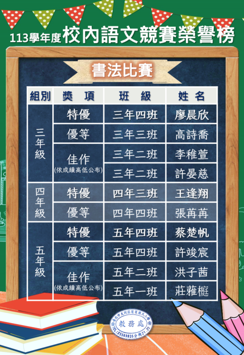恭喜各項目比賽獲獎同學,感謝各位家長、任課教師與各班級導師協助指導!