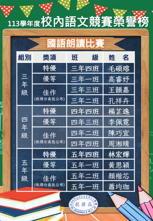 113學年度蓬萊國小校內科展競賽與多語文競賽(字音字形、書法、國語朗讀)成績公告