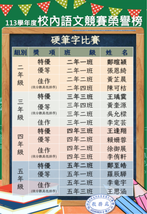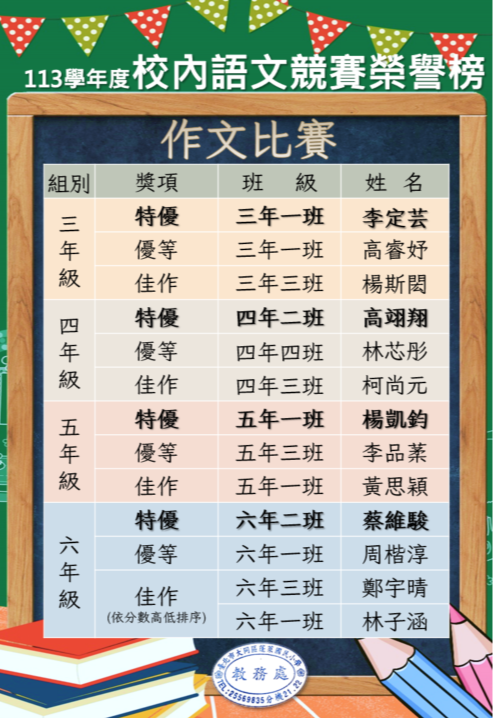 113學年度蓬萊國小校內多語文競賽(作文、硬筆書法)第二階段成績公告