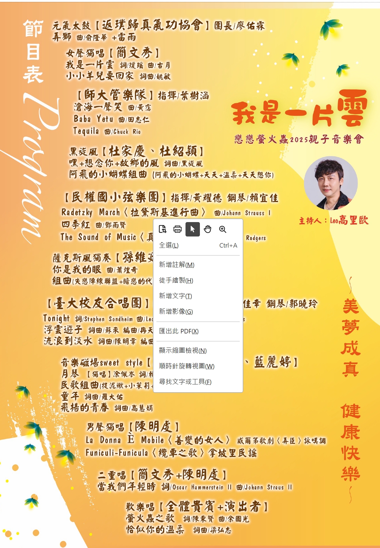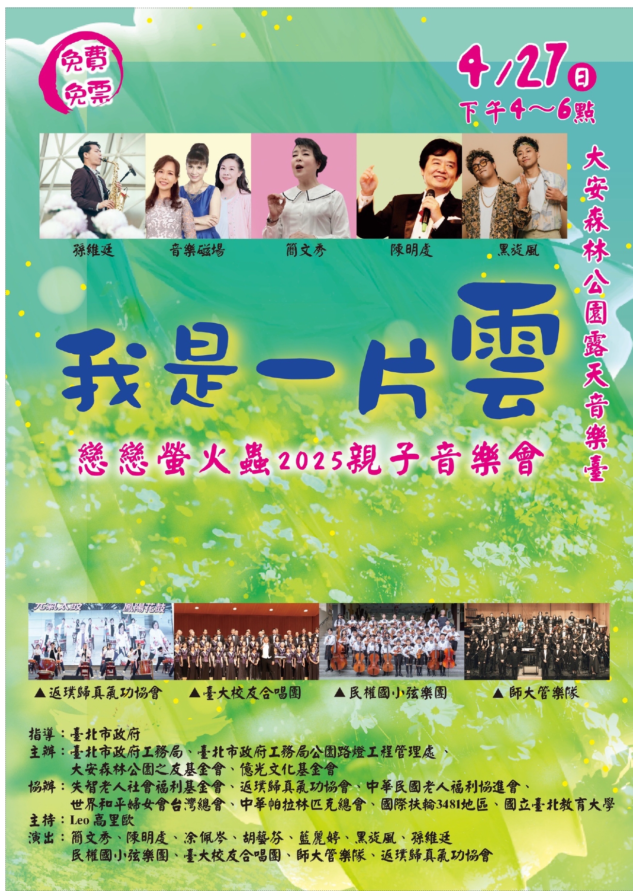 我是一片雲 戀戀螢火蟲 202 5 親子音樂會將於 4 月2 7 日下午 16 時 00 分至 18 時 00 分於大安森林公園露天音樂台舉辦,邀請您共享午後時光 」